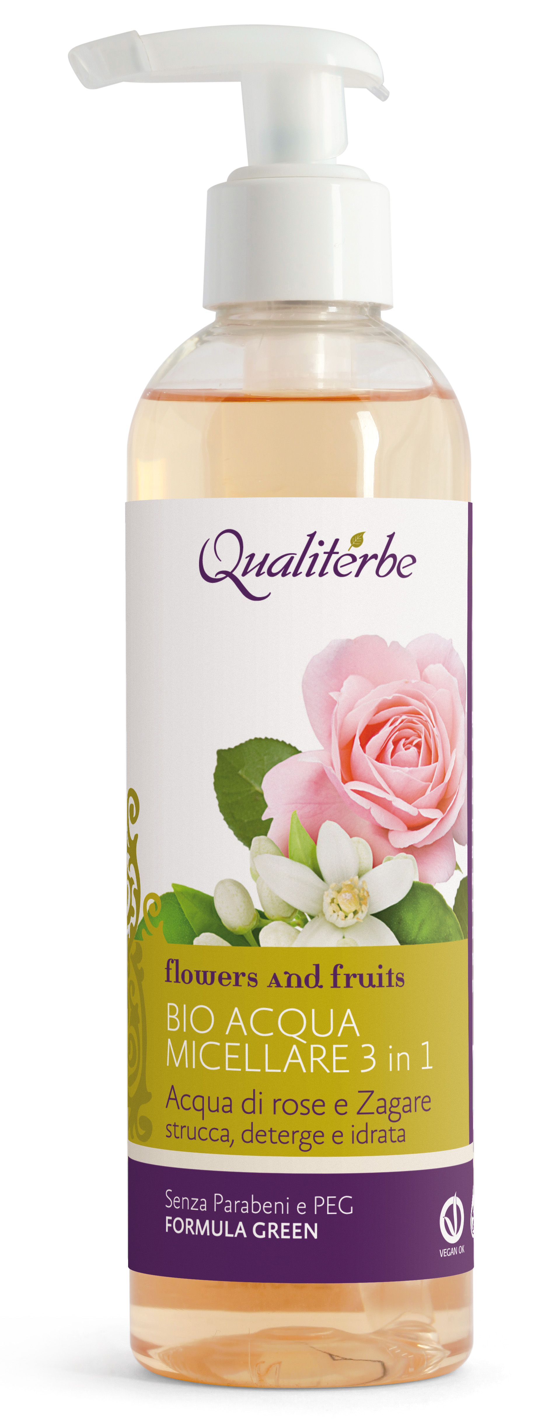 L’Acqua Micellare della linea Flowers and Fruits unisce l’attività detergente, tonificante e riequilibrante del film idrolipidico, grazie agli estratti vegetali di Rosa Centifolia, fiori d’Arancio, Rosa Canina e Ippocastano, che svolgono un azione tonificante, rivitalizzante e astringente sulla pelle, stimolandola, riattivandola e conferendole grande luminosità.