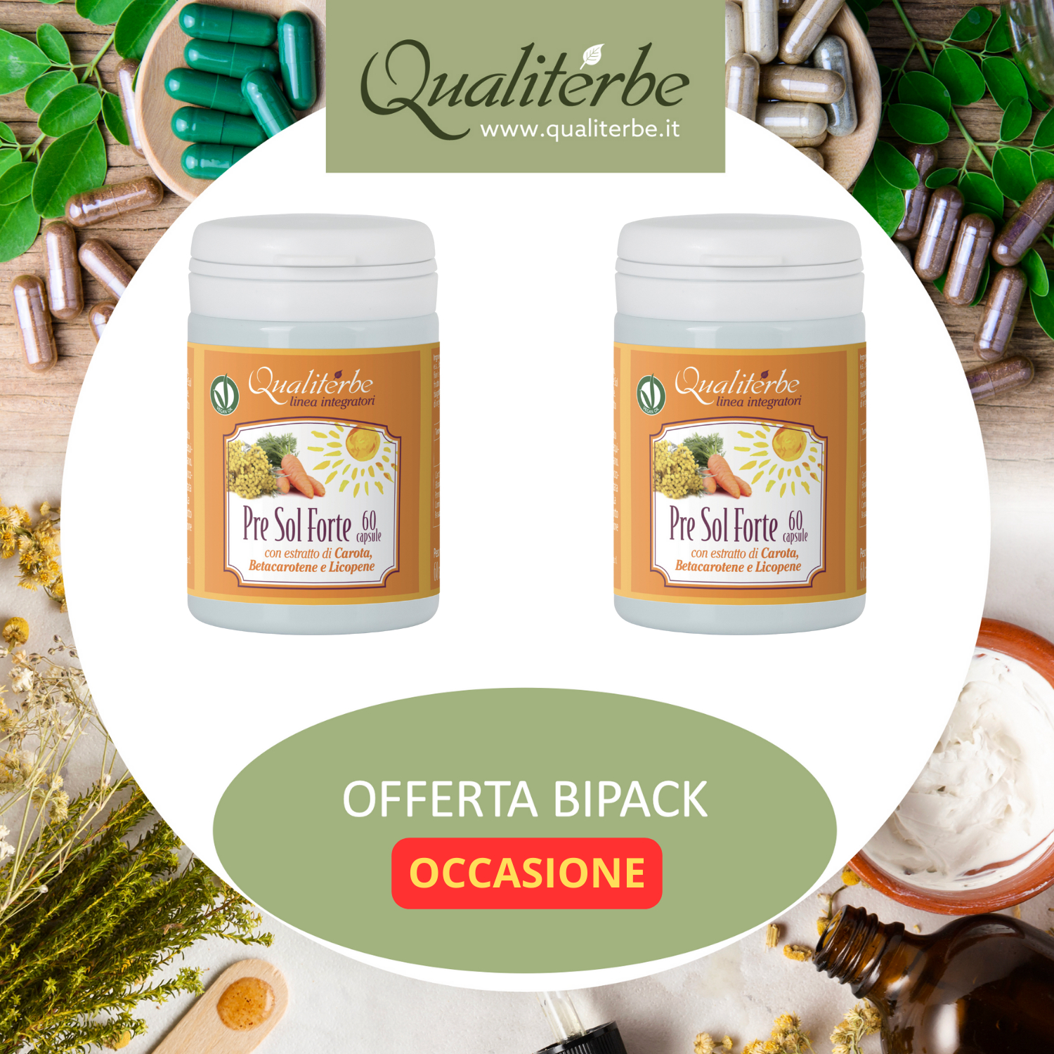 Integratore in capsule con Betacarotene, Vitamina E, Licopene e Olio di Carota. Contenuto: 2x60 capsule. Certificato Vegan OK, senza conservanti, coloranti e zuccheri aggiunti.